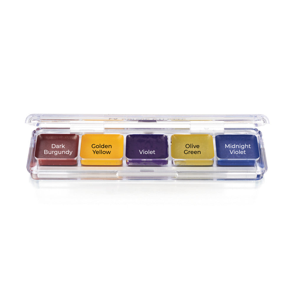 Primary Palette Contains - Black, Red, Yellow, Blue, White, Bruise Palette Contains - Dark Burgundy, Golden Yellow, Violet, Olive Green, Midnight Blue, Body Art Palette Contains - Vintage Black, Rose Red, Green, Bright Yellow, Vintage Green, Undead Palette Contains - Rice Paper, Vein Tone, Lividity, Dark Grey, Vile Bile