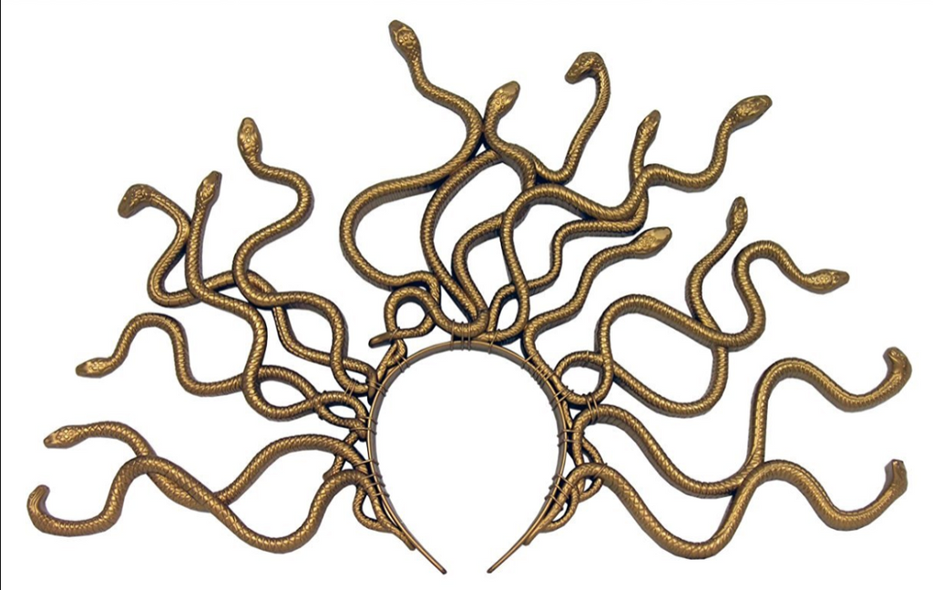 Poor Medusa, so beautiful she was cursed by a goddess! Now you can turn the legend of the curse into a costume blessing! This beautiful golden snake headband will complete your transformation. Headband is made from a gold plastic and resembles snakes springing from your head. Sixteen golden serpents contort and curl around each other in a unique asymmetrical style that will have onlookers captivated, having seemingly turned to stone. Headband is 17 inches wide and 6 1/2 inches tall. One size fits most.