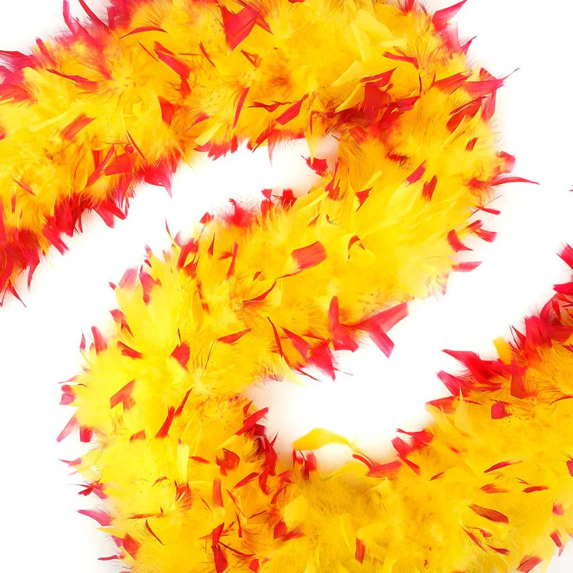 Glamorous chandelle turkey feather boa is accented with dyed tips. Full and luxurious quality suitable for dress, costuming, decorating or stage and theater. 100gr. 2 yard piece. NOTE: Color may vary. No guarantee on color fastness of dyed feathers.
