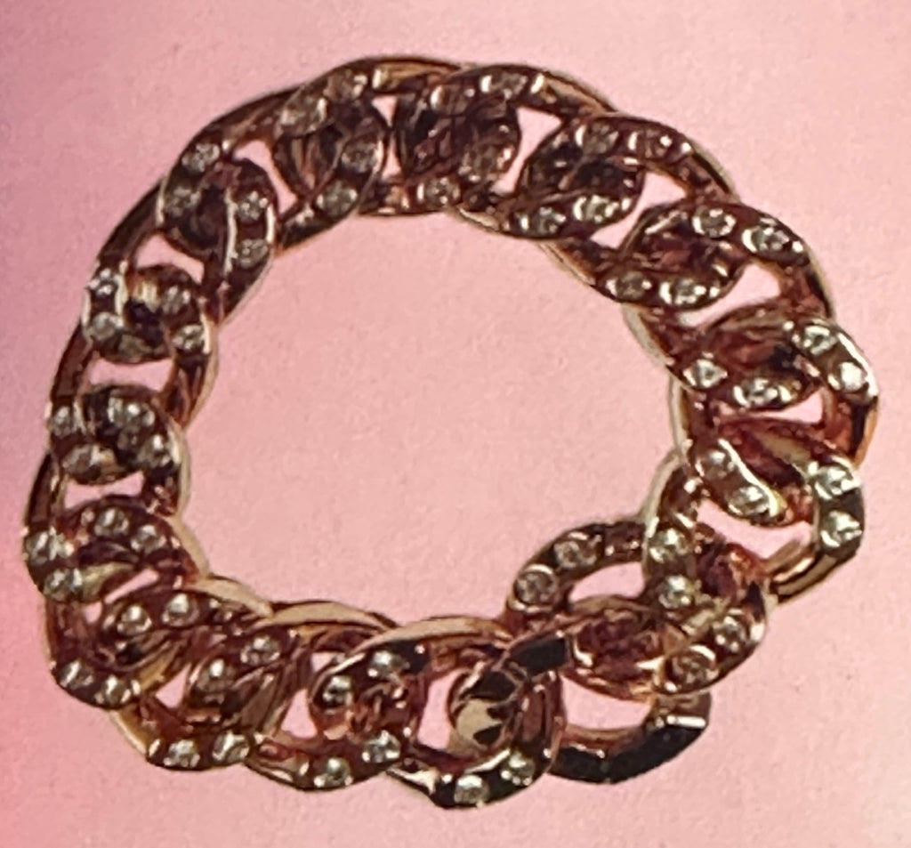 Costume jewelry bracelet with plastic rhinestones. One size fits most.